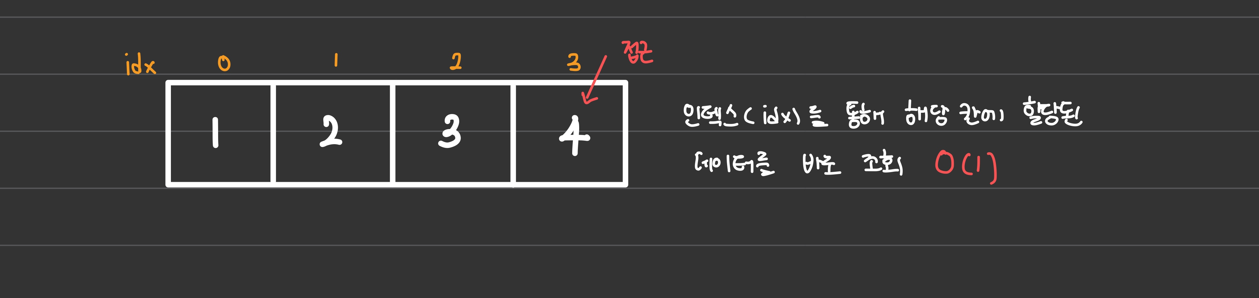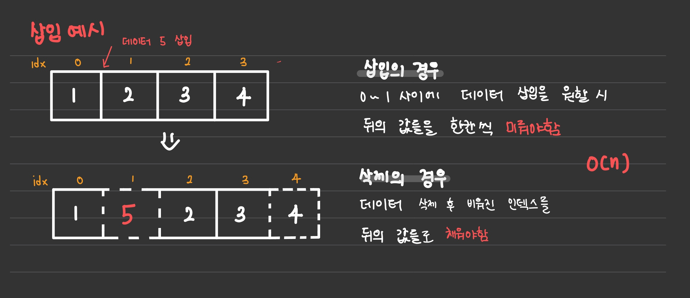 - ์กฐํ ๋ฐ ์์ ์๋ O(1), ์ฝ์ ๋ฐ ์ญ์ ์๋ O(n)์ผ ๋ณต์ก๋๋ฅผ ๊ฐ์ง๋๋ค.